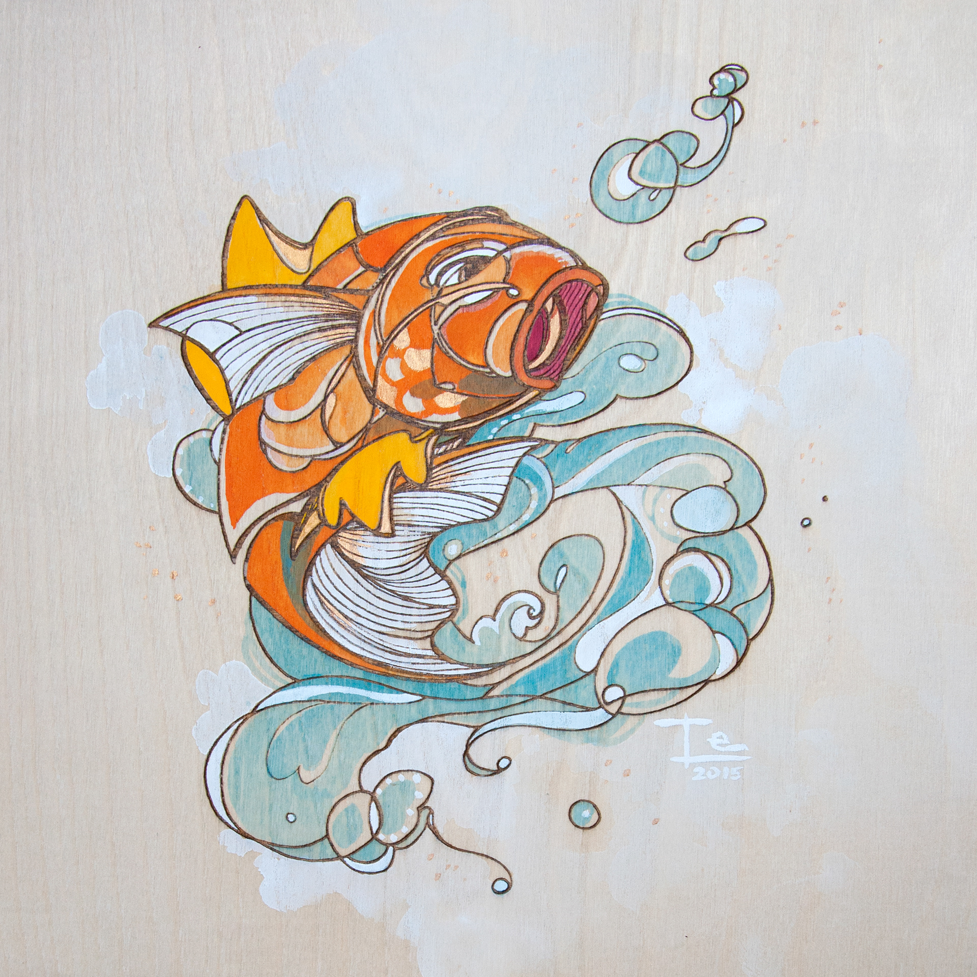 Interpretation of beloved carp Pokemon - first illustrated, the laser-engraved upon wood panel, primed and painted with watercolor and gouache.